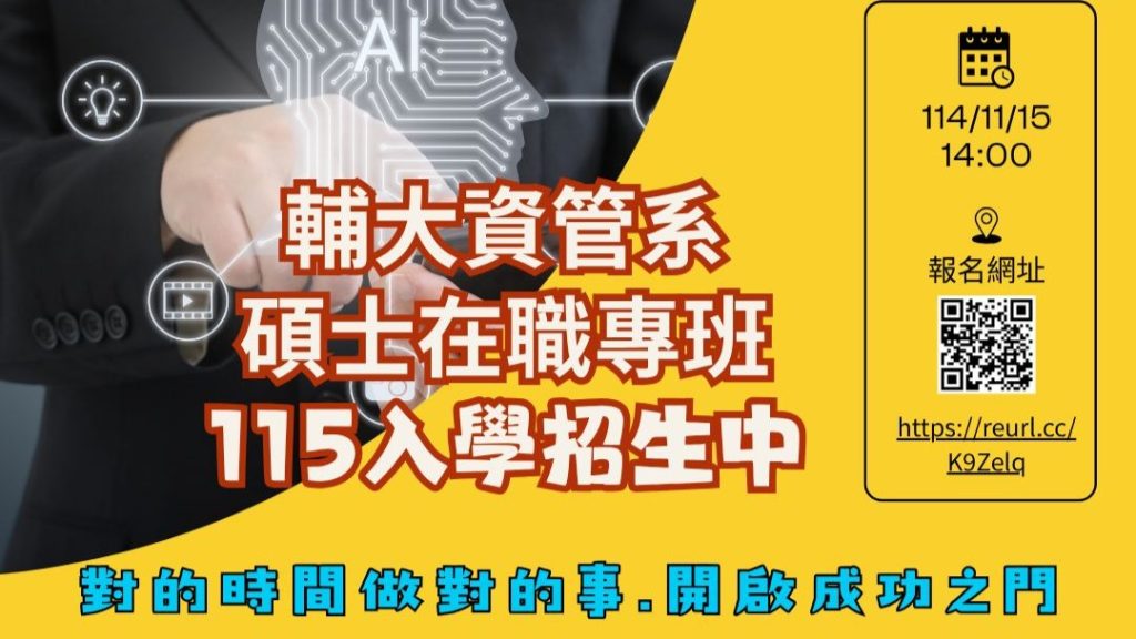 透過機測、專題及產業實習讓學生動手做高中生專區輔仁大學資管系歡迎您English培育開發AI應用及雲端服務的專業人才招生訊息開設實務學程提供學生多元學習建立第二專長高中生專區透過專題及產業實習與就業無縫接軌招生訊息Welcome to the Department of Information ManagementEnglish Previous slide Next slide 招生訊息 招生訊息 查看更多 2025-11-19 115學年入學碩士班招生 ~ 資料審查100%.無筆試 ! ~ 招生訊息, 碩士班考試 2025-11-18 輔大資管系115學年碩士在職專班,就是您最值得選擇的地方,歡迎報考~ 招生訊息, 碩士在職專班 2025-11-10 【面試延期公告】115學年度特殊選才招生面試延期至11月21日(五)舉行 招生訊息, 特殊選才 2025-11-01 輔仁大學資訊管理學系碩士在職專班招生說明會 招生訊息, 碩士在職專班 2025-10-24 115學年入學資管系碩士班甄試招生初審及格名單公告 招生訊息, 碩士班甄試 查看更多 得獎焦點 得獎焦點 【恭賀】本系吳濟聰老師與指導之學生參加『IMP2025第30屆國際資訊管理暨實務研討會』論文發表,榮獲『最佳論文獎』! 2026-01-08 【恭賀】呂奇傑老師帶領專題學生合作參與『2025 SIIF韓國首爾國際發明展』、『2025 高雄國際發明暨設計展』,分別榮獲銅獎與金獎成績! 2025-12-22 【恭賀】呂奇傑老師指導之專題學生參加『2025全國資訊管理前瞻技術研討會暨專題競賽 (AMITAC 2025)』榮獲D組第一名及總決賽第一名 2025-12-12 114學年度「鼓勵學士班成績優異學生就讀碩士班獎學金」獲獎名單 2025-12-11 2026-01-08 【恭賀】本系吳濟聰老師與指導之學生參加『IMP2025第30屆國際資訊管理暨實務研討會』論文發表,榮獲『最佳論文獎』! 師生榮譽, 榮譽榜 2025-12-22 【恭賀】呂奇傑老師帶領專題學生合作參與『2025 SIIF韓國首爾國際發明展』、『2025 高雄國際發明暨設計展』,分別榮獲銅獎與金獎成績! 師生榮譽, 榮譽榜 2025-12-12 【恭賀】呂奇傑老師指導之專題學生參加『2025全國資訊管理前瞻技術研討會暨專題競賽 (AMITAC 2025)』榮獲D組第一名及總決賽第一名 師生榮譽, 榮譽榜 2025-11-05 【恭賀】本系專題組學生參加『2025年第30屆大專校院資訊應用服務創新競賽』榮獲兩項佳作 師生榮譽, 榮譽榜 查看更多 查看更多 產業實習 產業實習 查看更多 114學年度資管系產業實習課程徵才資訊 2025-11-20 114學年度資管系產業實習–廠商徵才說明會 2025-10-20 【群益資訊部】大四~碩二實習生招募中 2025-10-01 【彰化銀行】2026校園實習生計畫 2025-09-30 查看更多 影音專區 影音專區 播放 畢業系友跟你說 播放 第40屆專題影片介紹 播放 讓我們一起開箱輔大資管系 GO~ 播放 輔大資管碩士在職專班113學年度中 上一篇 下一篇 最新公告 最新公告 重要公告 招生訊息 獎助學金 榮譽榜 企業徵才 學術活動 行政相關 2025-12-03 114學年度第2學期日間部學生繳交學雜費及各項費用相關事宜 行政公告 2025-11-25 114學年度第二學期選課須知,請注意各項選課時程 行政公告 2025-11-19 115學年入學碩士班招生 ~ 資料審查100%.無筆試 ! ~ 招生訊息, 碩士班考試 2025-11-18 輔大資管系115學年碩士在職專班,就是您最值得選擇的地方,歡迎報考~ 招生訊息, 碩士在職專班 查看更多 2025-11-19 115學年入學碩士班招生 ~ 資料審查100%.無筆試 ! ~ 招生訊息, 碩士班考試 2025-11-18 輔大資管系115學年碩士在職專班,就是您最值得選擇的地方,歡迎報考~ 招生訊息, 碩士在職專班 2025-11-10 【面試延期公告】115學年度特殊選才招生面試延期至11月21日(五)舉行 招生訊息, 特殊選才 2025-11-01 輔仁大學資訊管理學系碩士在職專班招生說明會 招生訊息, 碩士在職專班 查看更多 2025-12-11 114學年度「鼓勵學士班成績優異學生就讀碩士班獎學金」獲獎名單 學生榮譽, 獎助學金 2025-12-08 114-2學期生活助學金申請公告,📅申請期間於114/12/15至115/1/2止。 獎助學金 2025-10-16 114學年度「張宇恭神父獎助學金」申請事宜 獎助學金 2025-09-03 114學年度輔仁大學法、管、社科三學院「聖若望保祿二世獎學金」實施辦法及申請表 獎助學金 查看更多 2026-01-08 【恭賀】本系吳濟聰老師與指導之學生參加『IMP2025第30屆國際資訊管理暨實務研討會』論文發表,榮獲『最佳論文獎』! 師生榮譽, 榮譽榜 2025-12-22 【恭賀】呂奇傑老師帶領專題學生合作參與『2025 SIIF韓國首爾國際發明展』、『2025 高雄國際發明暨設計展』,分別榮獲銅獎與金獎成績! 師生榮譽, 榮譽榜 2025-12-12 【恭賀】呂奇傑老師指導之專題學生參加『2025全國資訊管理前瞻技術研討會暨專題競賽 (AMITAC 2025)』榮獲D組第一名及總決賽第一名 師生榮譽, 榮譽榜 2025-12-11 114學年度「鼓勵學士班成績優異學生就讀碩士班獎學金」獲獎名單 學生榮譽, 獎助學金 查看更多 2026-01-09 統一證券「115年上半年實習計劃」 企業徵才 2025-12-24 【企業徵才】美光招募中🤩 歡迎新鮮人及有經驗的系友加入! 企業徵才 2025-12-18 【證基會新進人員招募】 企業徵才 2025-10-01 【群益資訊部】大四~碩二實習生招募中 企業徵才, 產業實習 查看更多 2025-11-19 麻州大學達特茅斯分校教授研究分享暨演講公告 學術活動, 學術演講 2025-10-20 西南交通大學經濟管理學院 林楚彬教授 研究分享暨演講公告 學術活動, 學術演講 2025-05-19 講座:手把手教你-玩轉語言模型 學術演講 2025-04-16 2025跨校聯盟程式設計競賽 學術活動, 專題競賽 查看更多 2025-12-26 「115年