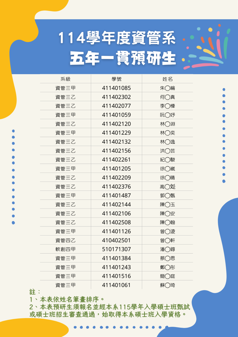 114學年度資訊管理學系五年一貫預研生榜單